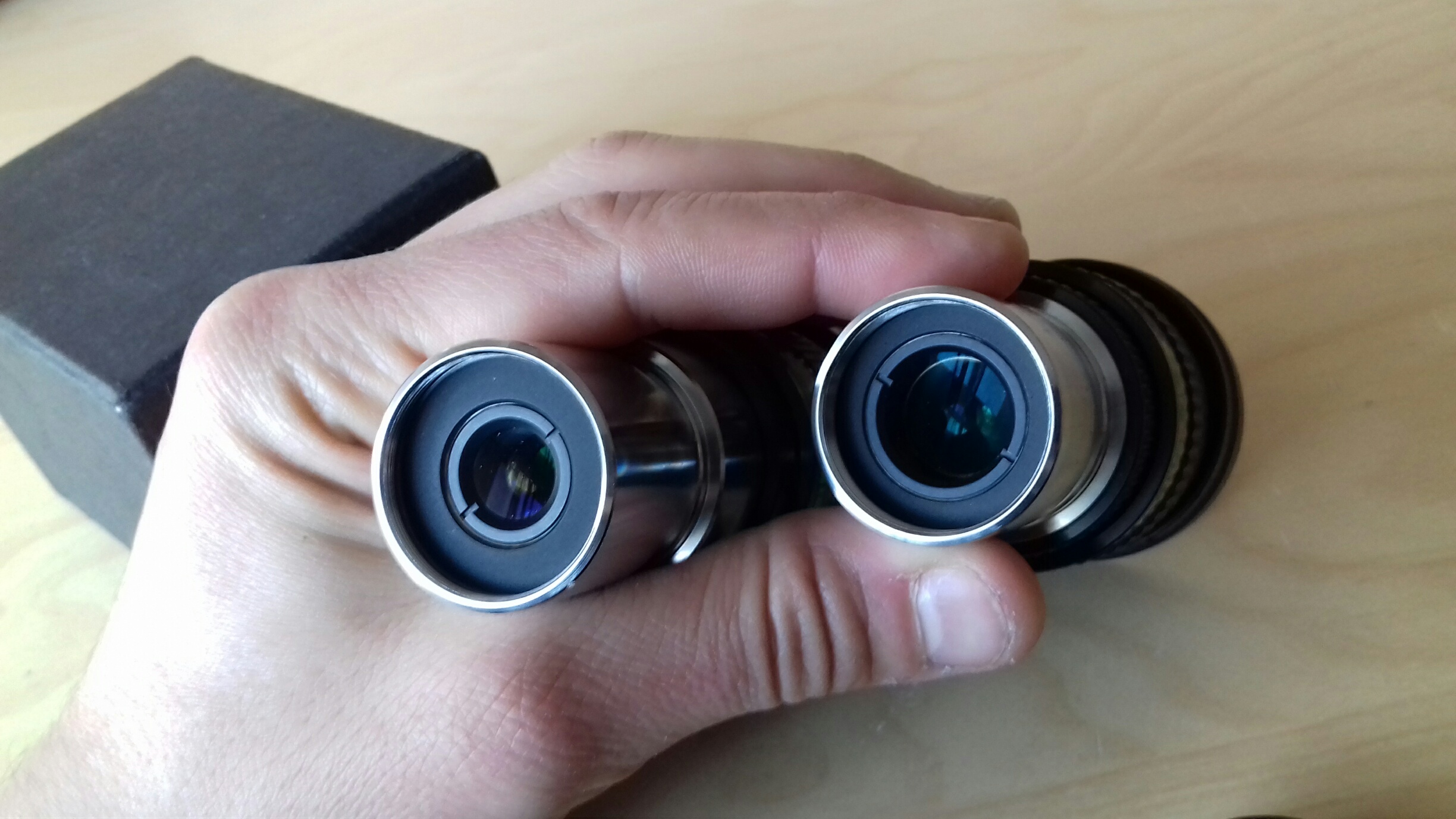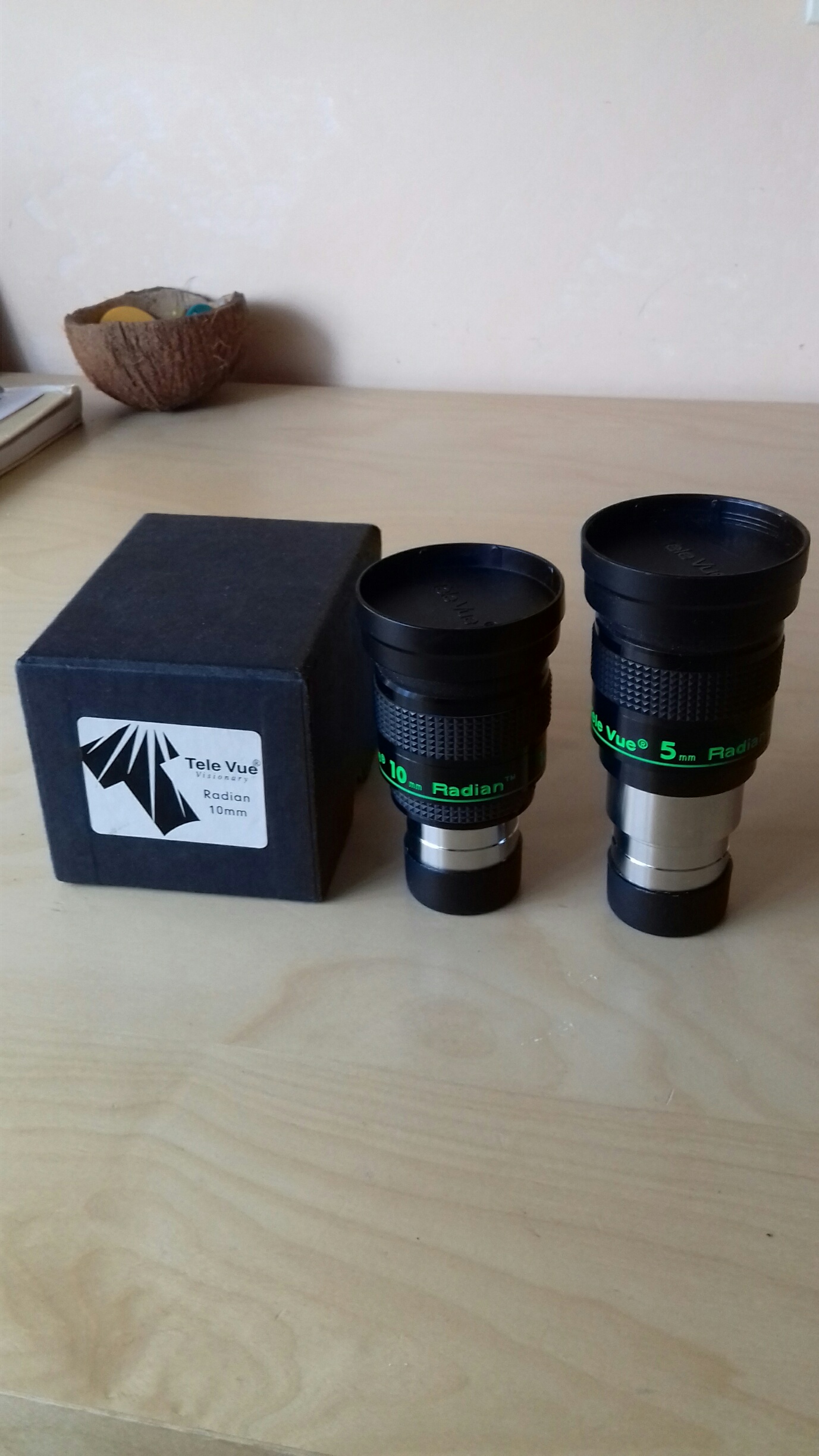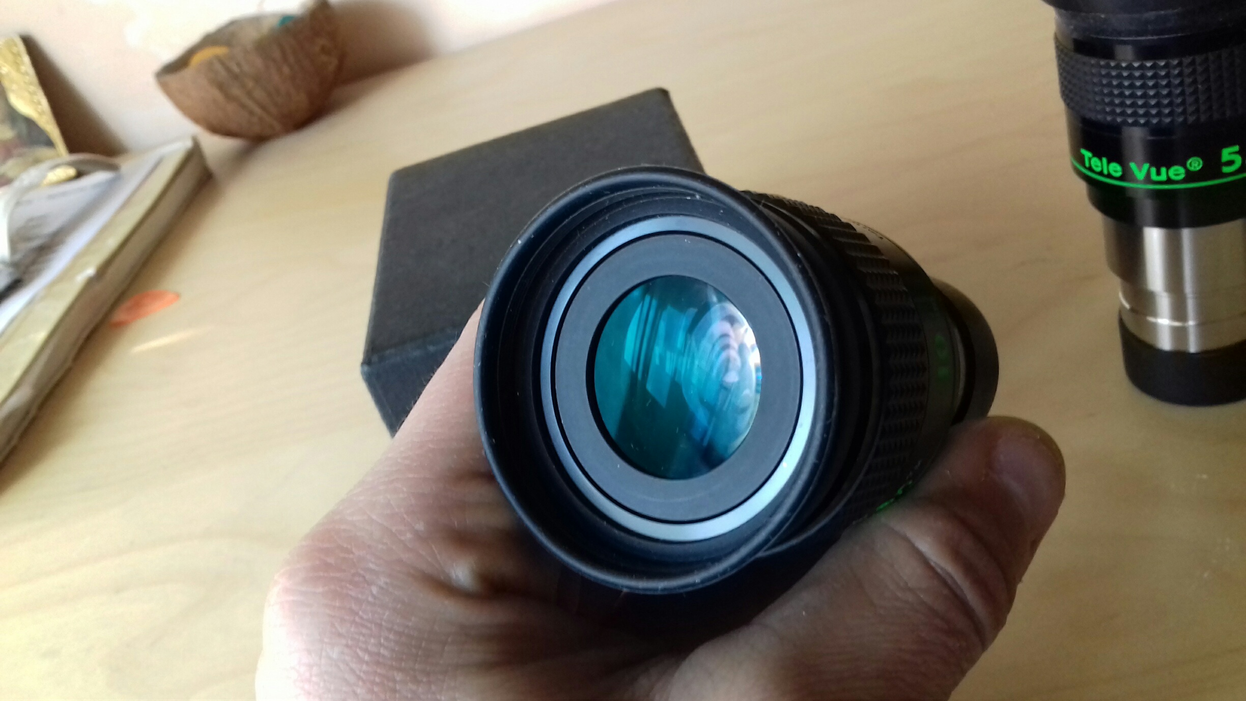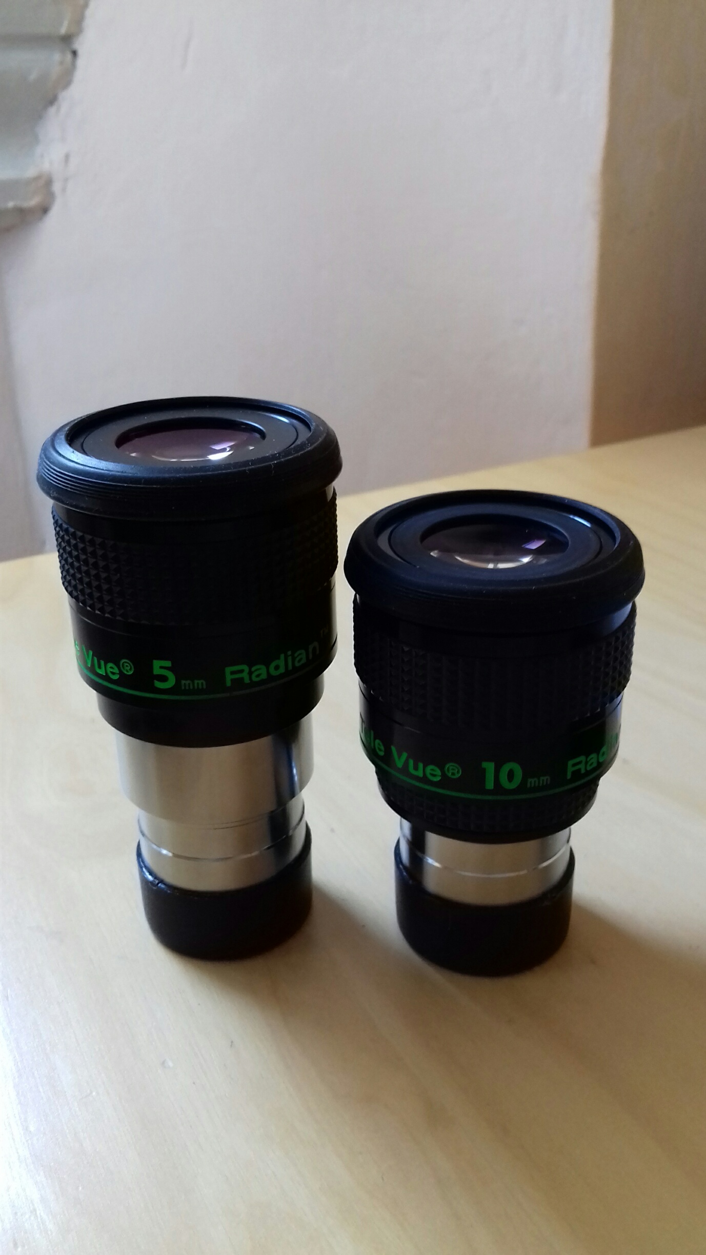 Nella mia carriera osservativa e tecnica ho avuto modo di utilizzare moltissimi oculari e svariate tipologie di schemi ottici. I RADIAN Televue di cui finalmente pubblico una recensione e di cui mi scuso per l'enorme ritardo dato che ormai sono fuori produzione, sono tra gli oculari che di più mi hanno impressionato sul planetario. Lo schema ottico che prevede 7 o 6 elementi in 5 o 4 gruppi è un classico tele negativo in cui il primo gruppo ottico che garantisce l'ampio campo ed il comfort osservativo viene "negativizzato" da un doppietto o tripletto di tipo barlow che si trova in fondo al barilotto. La differenza è che qui lo schema ottico è relativamente più complesso in termini di gruppi ottici e relative superfici. La costruzione è imponente, sono oculari pesanti, meccaniche e finiture di pregio, paraluce estraibile a scatto. Gomma zigrinata per una presa efficace. Annerimento interno esemplare, filettature degli spaziatori che non introducono riflessi, insomma un capolavoro. ![]() Le