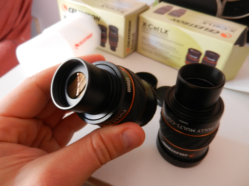 La prova sul campo ha mostrato come entrambe le focali siano ben corrette dalla distorsione sebbene quest'ultima era maggiore nel 25mm, mentre nel 12mm si evidenziava praticamente un campo flat. Ottima e comodissima l'estrazione pupillare. Appare un po di cromatica laterale in entrambi gli oculari spostando gli oggetti a bordo campo. Immagini diurne e poi sulla luna a metà della sua fase hanno mostrato un'eccellente contrasto al centro del campo, con immagini sature e ben bilanciate cromaticamente, l'errore di parallasse è minimo in queste due focali e l'astigmatismo si evidenzia solo ai bordi estremi in particolar modo abbinandoli a rifrattori di corta lunghezza focale. Muovendo un antenna dal centro al bordo del campo la distorsione è controllata alla perfezione nel 12mm , mentre nel 25mm si nota una leggera deformazione delle linee rette a circa il 70% del campo apparente. Sulla Luna i dettagli erano scolpiti in entrambe le focali, davvero notevole il contrasto sfoggiato, complice anche un ottimo rifrattore ED da 110mm. Ombre nettisime e al terminatore non si nota luce diffusa, anche facendo entrare la luminosa falce lunare dal bordo del campo, il contenimento dei riflessi è esemplare. Il campo pratricamente flat dona una elevata profondità e percezione degli oggetti osservati che sembrano staccarsi dal fondo cielo. Il campo ampio di circa 60° li rende una scelta idonea nelle osservazioni deep sky ove ho potuto fruire di una ottima visione, molto cristallina di oggetti come Pleiadi e Nebulosa di Orione a seguire, quest'ultima mostrava delle delicate strutture e stelle debolissime che a malapena si notavano sostituendo gli Xcel-lx con dei plossl di eccellente fattura, a conferma della validità di quest'ultima serie Celestron. Il 25mm Plossl made in taiwan oltre ad avere un campo minore mostrava una distorsione nettamente maggiore ed il medesimo contrasto pur utilizzando soli 4 elementi ottici, mi ha sorpreso come i dettagli minuti fossero gli stessi e intuibili immediatamente nel Celestron, mentre nei Plossl serviva una maggior pazienza e stabilità dell'aria per avere in alcuni momenti la qualità in asse degli Xcel. L'osservazione di Giove e poi di Venere con entrambi gli oculari è stata gradevole, con immagini molto contrastate dei due pianeti, poca o nulla luce diffusa attorno e totale contenimento dei riflessi che ad esempio in un Radian da 10mm e 6mm si notavano in contemporanea come un pallino danzante e fastidioso all'interno del campo apparente. (fenomeno dovuto all'elevata concavità della superficie che si offre all'occhio dell'osservatore) Bellissime alcune stelle doppie che si mostrano come punte di spillo ben sature e ad ingrandimenti più sostenuti ben regolari nelle centriche. Ottima la stabilità e luminosità delle immagini riscontrata. Gli ingrandimenti compresi tra i 35x ed i 100x e poi raddoppiati con una Barlow 2x, hanno soddisfatto a mio parere tutte le esigenze di un'osservatore attento ai particolari che non vuol rinunciare ad una buona qualità ottica e solidità costruttiva. Sono oculari che rendono molto su configurazioni ottiche a campo corretto, l'impiego su un Newton 150/750 affetto da aberrazione di coma li rende inutilizzabili a metà campo, così come rifrattori molto aperti non consentono di fruire della buona correzione extrassiale insita nei celestron Xcel-lx. Si possono abbinare ad una buona Barlow come la Xcel-lx tanto per rimanere in casa Celestron, ma c'è da aspettarsi una decisa vignettatura sulle focali più lunghe ove se si vuole ovviare all'incoveniente è bene procurarsi una Barlow da 2 pollici. Il 7mm recentemente testato si è mostrato un oculare eccellente, contrasto alla pari dei baader genuine ortho, Morpheus o blasonati televue - pentax, nettamente superiore agli hyperion. Campo piano e immagini puntiformi fino al bordo. Le immagini di Giove restituite erano scolpite, dotato di comodità estrema e purezza di immagine notevole. Lievissima cromatica laterale e una elevatissima sensibilità alle polveri che si depositano sulla lente vicina al piano focale sono gli unici difetti che mi sento di muovere contro questo schema ottico. Non ho avuto modo di provare le focali più corte come il 5mm e il 2,3mm, ma aggiornerò il mio test non appena ne fruirò. Le mie impressioni sugli oculari esaminati sono positive, eccellente la costruzione meccanica e altrettanto valide le performance ottiche che hanno sfoggiato nel test eseguito. Il prezzo attuale di circa 109 euro a mio parere un po elevato è giustificato dall'ottimo design e dalle prestazioni ottiche di tutto rispetto che si ottengono. Personalmente il 12mm l'ho trovato più corretto del 13mm Hyperion e dei Flat field; superiore anche al WIlliam Optics SPL 12,5mm e ad ortoscopici di pari focale nel complesso. Il 25mm pur avendo un campo lievemente inferiore all' Hyperion da 24mm offre le medesime performance anche se è presente una lieve distorsione, ma a differenza del Baader in questa focale la messa a fuoco è identica ai bordi come al centro, mentre nell'Hyperion ho spesso notato come si necessiti di una lieve rifocheggiatura delle stelle ai bordi, specie se abbinato a telescopi rifrattori. Il contrasto inoltre è superiore nel Celestron rispetto al Baader hyperion da 24mm. Il 12 e il 7mm offrono performance in asse che sono offerte dai migliori ortoscopici ma con un campo piano di ben 60°. Sono paragonabili come prestazioni ai Radian, rispetto ai quali vantano il medesimo contrasto ed un miglior contenimento dei riflessi su oggetti luminosi. Concludendo, nonostante il difetto di una non pefetta messa a fuoco e calibrazione del diaframma di campo (in particolar modo nel 25mm) che quasi sempre si trova in questa tipologia di oculari, mi sento di promuovere a pieni voti le focali esaminate. Alto contrasto, buonissima qualità ottica ed eccellente costruzione sono i punti a favore di questa serie. Ringrazio la ditta ARTESKY di Novara per l'esemplare da 12mm messo a disposizione